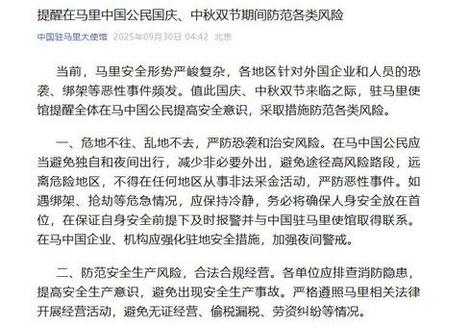 据中国驻马里使馆微信公众号消息,当前,马里安全形势严峻复杂,各地区针对外国企业和人员的恐袭、绑架等恶性事件频发。值此国庆、中秋双节来临之际,驻马里使馆提醒全体在马中国公民提高安全意识,采取措施防范各类风险。