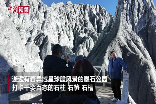 11月10日,20余位参加2025海外华文媒体甘孜行的媒体代表走进四川甘孜州道孚县,邂逅有着异域星球般风景的墨石公园,打卡千姿百态的石柱、石笋、石槽。这里的“墨石”学名为糜棱岩,是岩石受断裂构造影响,经强烈挤压破碎成粉末状后,再胶结而成的变质岩。