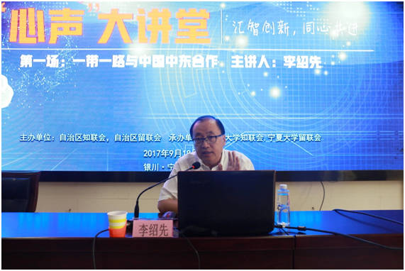中国中东问题著名专家、中国现代国际关系研究院前副院长、宁夏大学中国阿拉伯国家研究院院长、博士生导师李绍先教授作了题为“一带一路与中国中东合作”的主题报告。李绍先教授以“中东大乱局及一带一路背景下中国的应对”为主线,从历史和现实、内因和外因等多个视角,分析了中东大乱局出现的原因,阐释了当前中东政治版图和政治秩序的现状,中国应当趋利避害、因势利导,加强与中东地区的互联互通,突出双边和注重区域合作,推进与阿拉伯国家的合作,实现合作发展、互利共赢。李绍先教授的报告深入浅出、旁征博引、精彩纷呈,使在场的人员享受了一次丰盛的文化大餐。