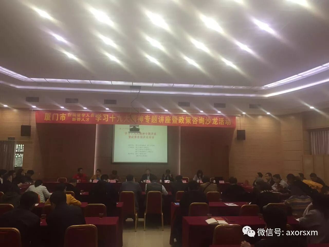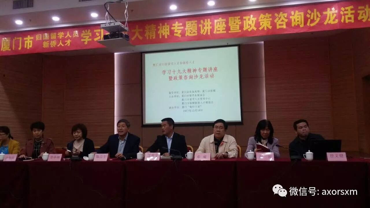 12月16 日我会与市留学人员管理中心、市侨联新侨人才联谊会联合主办厦门市归国留学人员和新侨人才学习十九大精神专题讲座暨政策咨询活动。市委统战部副部长郑秀文向大家作了党的十九大精神专题辅导报告。郑副部长着重从“新时代、新思想、新矛盾、新征程”等关键词的视角,