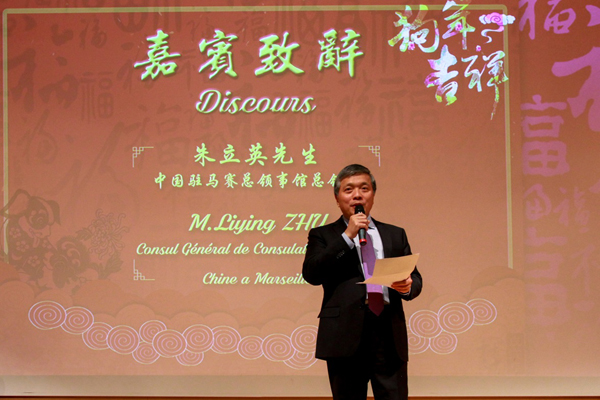 朱立英总领事在晚会致辞时首先向马赛华人及留学生、法国友人送来新春祝福,他说,马赛学生奋发有为,才华洋溢,自己深受感染,感觉自己也变年轻了。朱总领事向全体观众介绍了2月24日晚上“丝路津韵”天津艺术团的表演以及2月25日举行的马赛十年来最大的华人迎新春大游行,让更多的人能感受到中国文化魅力。他提到1月初法国总统马克龙访华,中法关系日益深入,“一带一路”政策也为大家提供更多的就业机会。朱总领事也提到2017年10月召开的党的十九大会议,让全世界看到了中国的强大,也让我们留学生和海外华人不论今后在哪里发展,都将有更坚强的主心骨。最后,朱立英总领事祝愿马赛留学生们平安留学、快乐留学,保持身心健康,让家人放心,狗年学业进步、吉祥如意。
