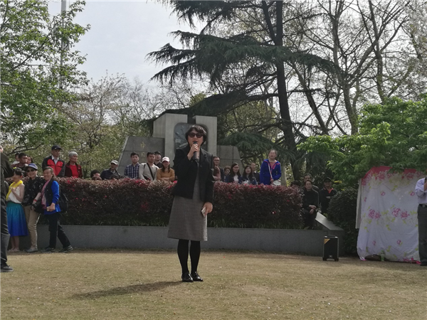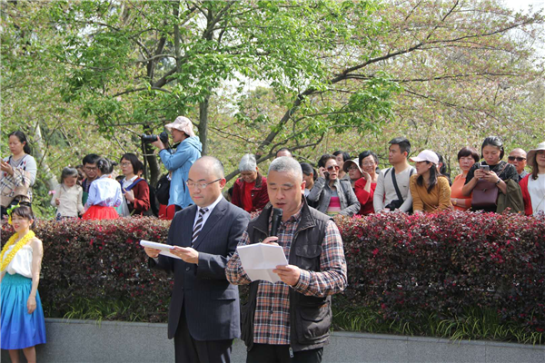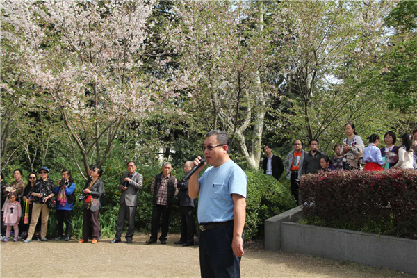 留日分会秘书长胡志武代表总会常务副会长、留日分会会长臧广陵致辞,对“植树赏樱”活动的主旨作了清晰的阐述。自2009年以来,留日分会以樱为媒、花为信,持续八年开展“植树赏樱”活动,共种植了800多棵樱花树,从鲁迅公园绵延至地铁8号线虹口足球场站1号出口处,成为市民赏樱拍照的好去处,在网络上享有上海“最美地铁口”的美誉。今年3月3日,留日分会会员40多人和片山总领事、小林理事长等日本友人挥锨落锹,又在鲁迅公园“中日樱花园”种植了50株樱花树。如今,这些樱花树枝繁叶茂,标志着中日两国民间友好交流的日益成熟;这片樱花林在鲁迅公园茁壮成长,成为中日友谊长青的见证。知日、爱国的留日分会,是推动中日关系持续和谐发展的主力军、生力军。今年,留日分会还将在总会的指导下,策划、组织一系列纪念活动,增进两国人民的相互了解、认知和友谊。希望中日双方友好人士相向而行,不断推进两国民间友好交流,共同为中日关系改善发展注入更多正能量。