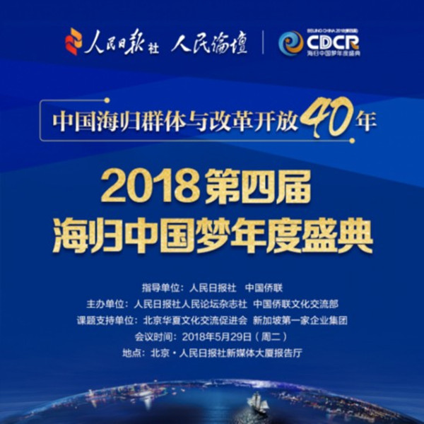 海归推动中国,梦想照耀征程。由人民日报社、中国侨联指导,人民日报社人民论坛杂志社与中国侨联文化交流部共同主办的“中国海归群体与改革开放40年——2018第四届海归中国梦年度盛典”将于2018年5月29日在京举办。会议邀请全国人大副委员长、全国政协副主席、相关部委与地方领导、海归中国梦年度人物代表、权威专家学者、知名企业家、海归精英等300余人与会。