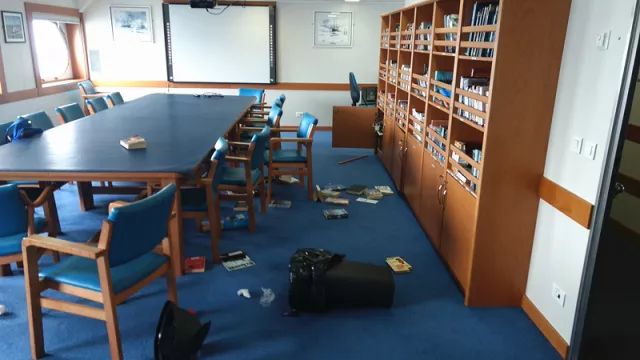 船上的会议室经风暴洗礼后的凌乱景象