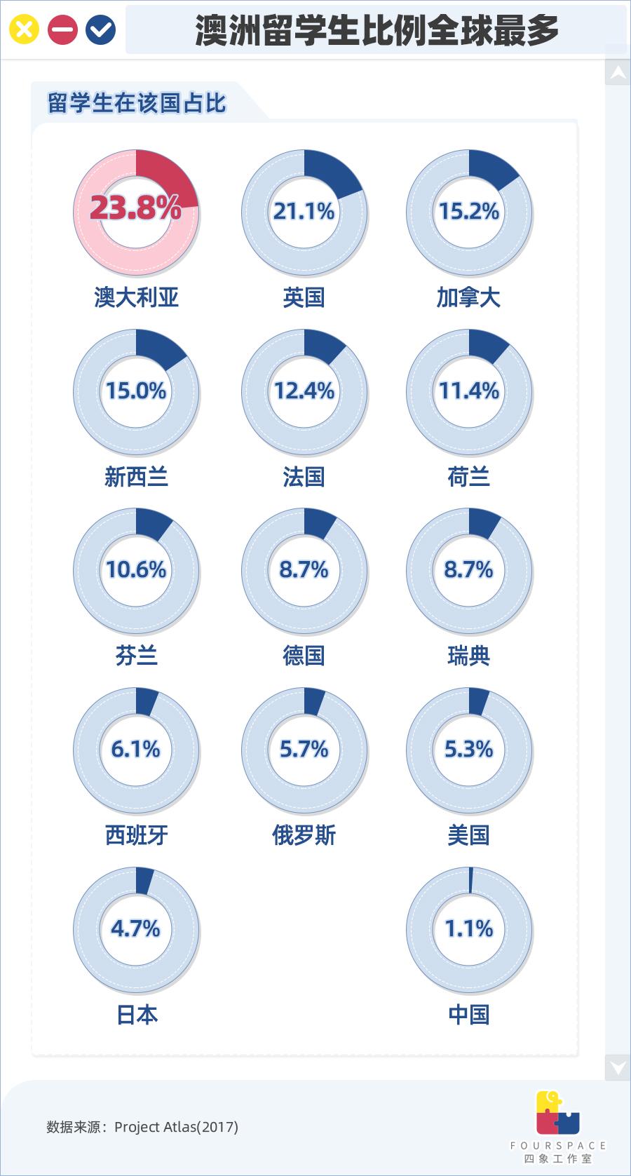 而我们印象中留学的首选地美国,海外留学生仅占5.3%。这说明美国虽然留学生总数多,但是教育产业并非依赖留学生,而留学生占比将近1/4的澳洲如果失去留学生,对该国经济绝对是沉重打击。