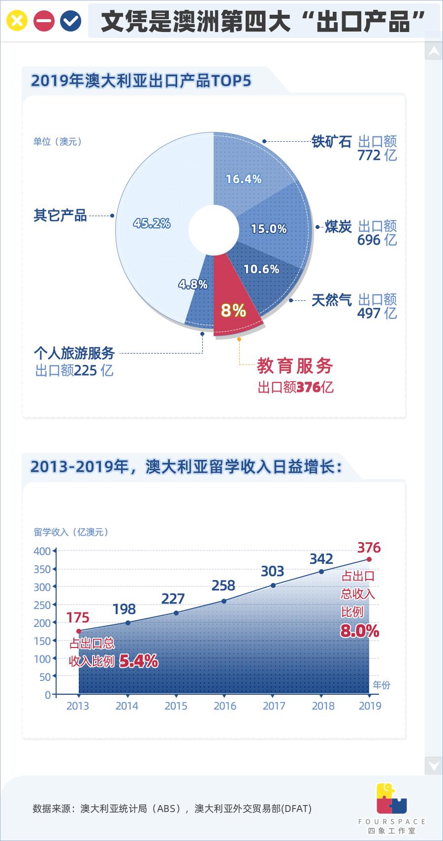 我们都知道澳大利亚是骑在羊背上的国家,而你或许不知道的是,它同样还骑在留学生的背上。根据澳大利亚外交贸易部2019年数据,国际教育是继铁矿、煤炭、天然气之后的第四大“出口产品”,在出口总额中占比8%。