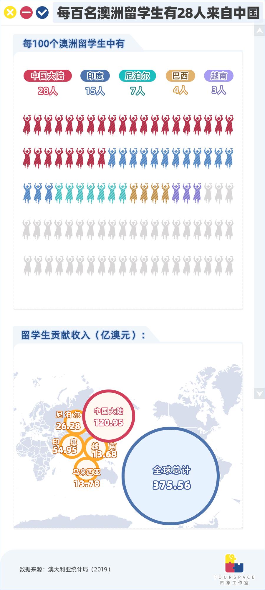 2019年中国留学生约贡献了澳大利亚国际教育收入的1/3。澳大利亚新闻网报道称,澳洲大学近年来依赖国际学生作为“摇钱树”,以保持资金流入并提高在全球大学排名中的地位。