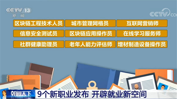 此次发布的9个新职业分别是“区块链工程技术人员”“城市管理网格员”“互联网营销师”“信息安全测试员”“区块链应用操作员”“在线学习服务师”“社群健康助理员”“老年人能力评估师”“增材制造设备操作员”。