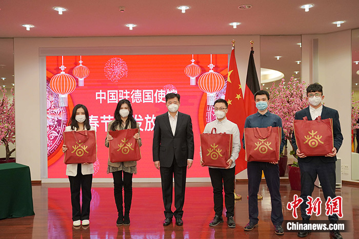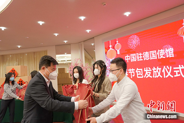 中新社柏林2月5日电 (记者彭大伟)中国驻德国大使馆5日举行“春节包”发放仪式,正式开始向领区内旅德中国公民发放“春节包”,为同胞们送去新春佳节的问候和祝福。
