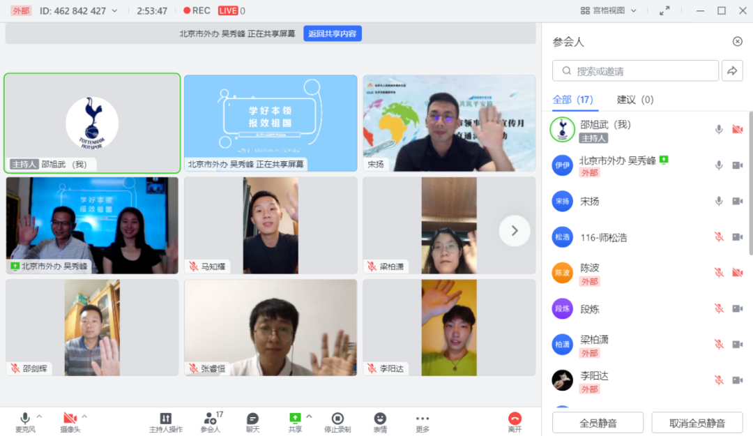 英国京籍同学会会长宋扬,西班牙人文社科学者学人联合会主席段炼,全法学联副主席师松浩,匈牙利北部分学联副主席杨仪,美西南学联理事马知耀,美国华盛顿大学学联主席闫雪,悉尼科技大学中国学联主席张睿恒,牛津大学学联秘书长肖云,7名海外学联负责人和6名即将出国的留学生参加了线上交流。1080余名市欧美同学会理事、会员和出国留学生通过抖音直播观看了活动。