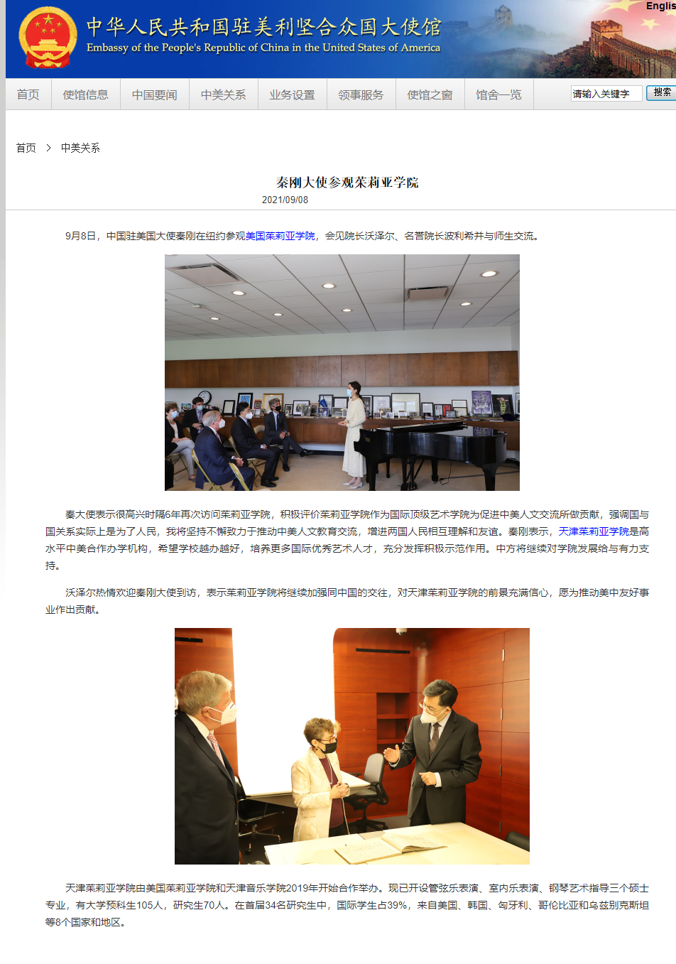 秦大使表示很高兴时隔6年再次访问茱莉亚学院,积极评价茱莉亚学院作为国际顶级艺术学院为促进中美人文交流所做贡献,强调国与国关系实际上是为了人民,我将坚持不懈致力于推动中美人文教育交流,增进两国人民相互理解和友谊。秦刚表示,天津茱莉亚学院是高水平中美合作办学机构,希望学校越办越好,培养更多国际优秀艺术人才,充分发挥积极示范作用。中方将继续对学院发展给与有力支持。