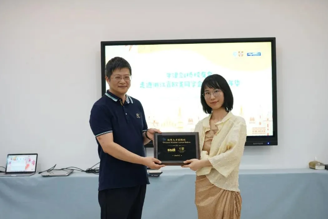 浙江省欧美同学会副会长唐睿康(左)向校友会负责人授牌