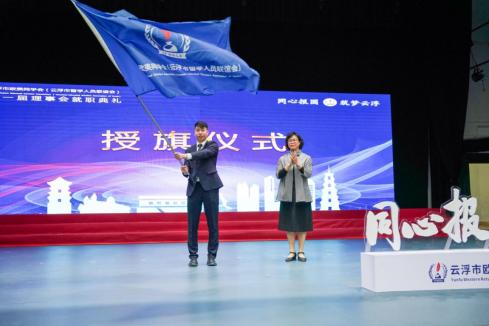 大会选举产生云浮市欧美同学会第一届会员大会领导机构及监事会成员,梁丽娴为新当选的会长谢杰授旗。
