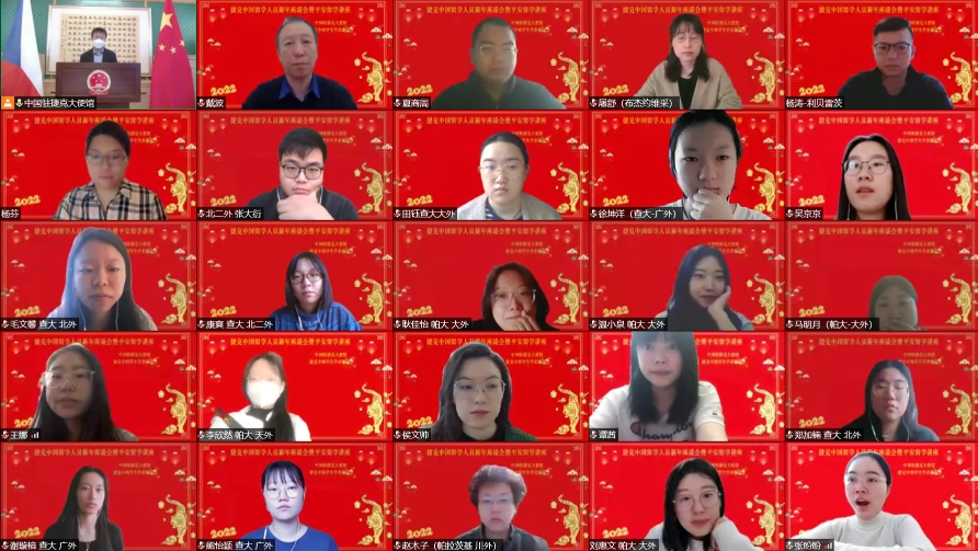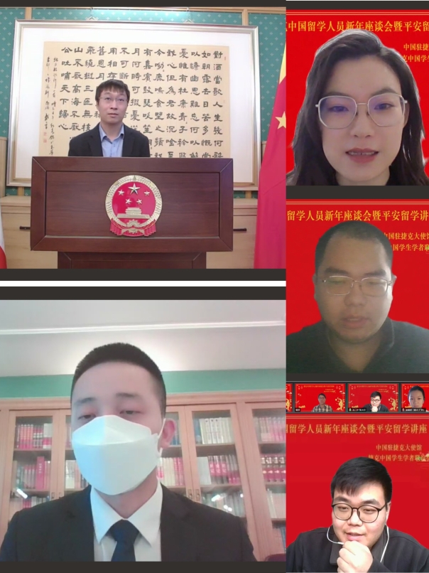 1月8日,中国驻捷克使馆和捷克中国学生学者联谊会共同举办捷克中国留学人员新年座谈会暨平安留学在线讲座。驻捷克大使张建敏、驻捷克使馆教育负责人蒋宇鹏、全捷学联主席戴波及78位来自捷克各地高校的同学共同参会。