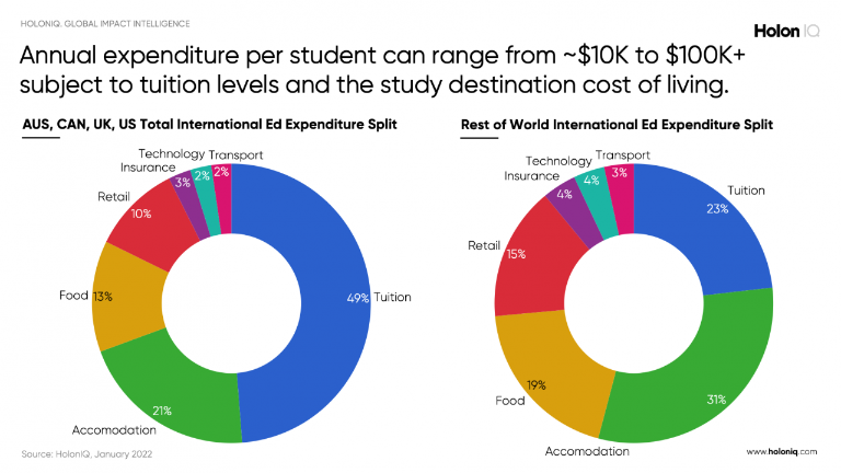 英美澳加四大国和世界其余国家的留学费用分布。图片来源:HolonIQ报告