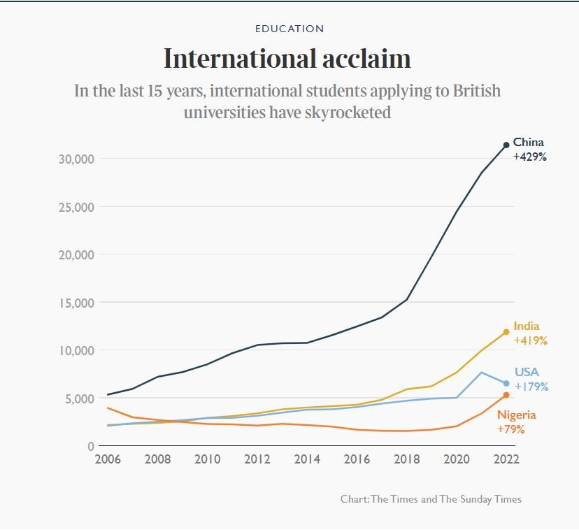 UCAS就业指南(Career Finder)网站显示,去年该网站独立搜索次数达创纪录的215万次,比上年增加了4%,点击申请次数达243138次,比去年的228124次增加了6.6%。国际学生,特别是来自中国和印度的国际学生申请数量大幅增长。近13.5万名国际学生提交申请,比2021年增加了3%。来自中国的申请人数增加了10%,为31400人,印度增加了20%,为11880人,尼日利亚增加了58%,为5290人。中国申请人数超过了北爱尔兰和威尔士25000人的总和,自2018年以来申请人数翻了一番。