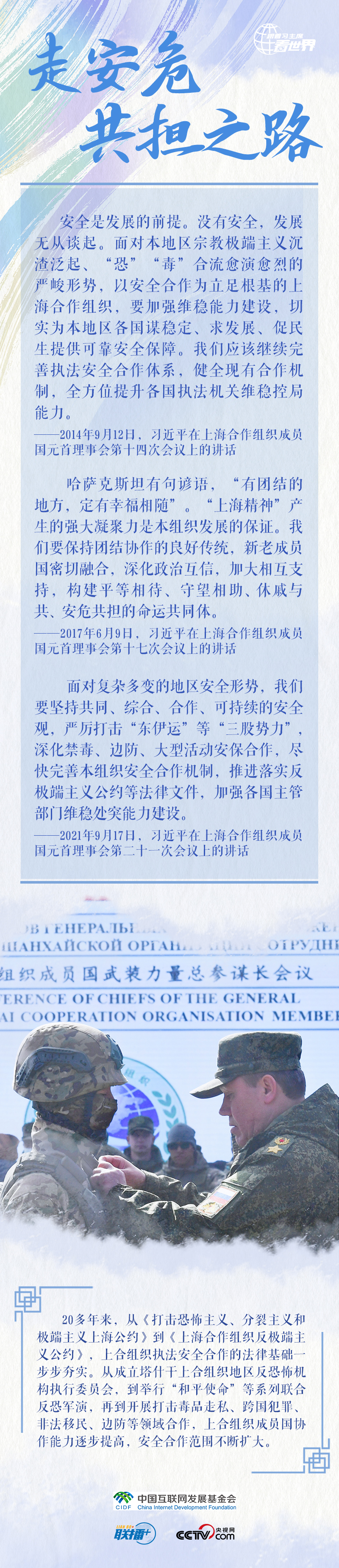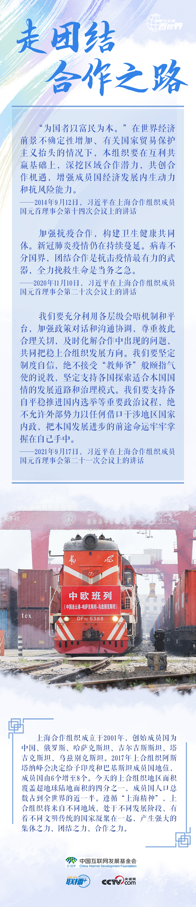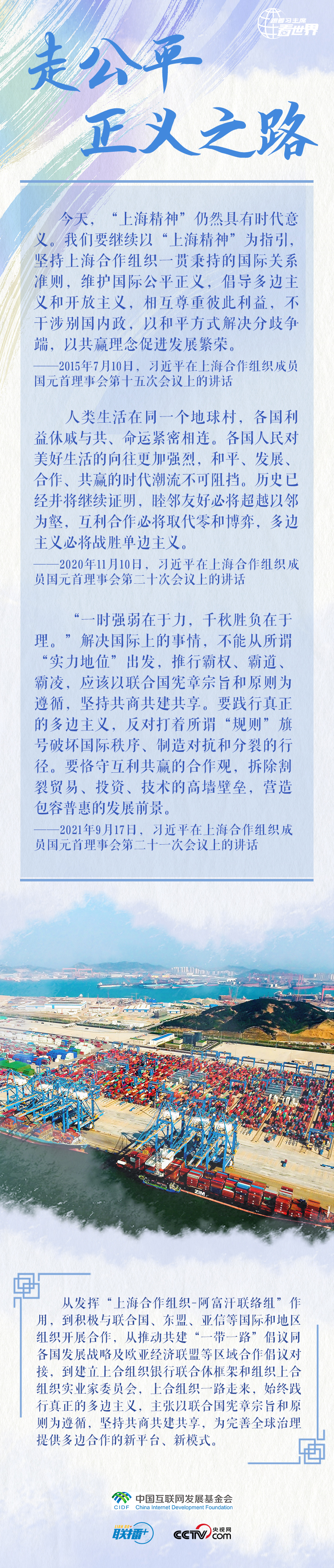 奏响合作之声,凝聚众行之志。2021年,在上海合作组织成员国元首理事会第二十一次会议上,习近平主席提出五点建议,为上合组织未来发展引领方向——上合组织成员国要走“团结合作之路”“安危共担之路”“开放融通之路”“互学互鉴之路”“公平正义之路”。此前,习主席在出席上合峰会时对这五条“路”也有不同阐释。