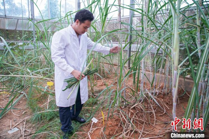 图为谢光杰在观察甘蔗生长情况。 陈冠言 摄