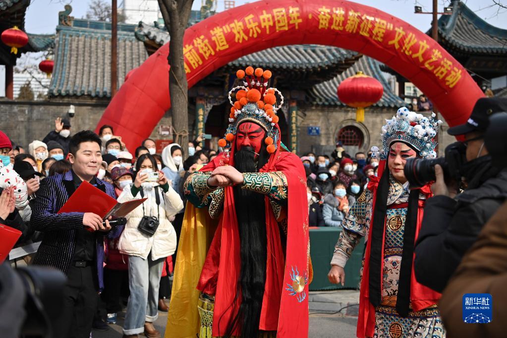 2月2日,在山西太原迎泽区庙前街道举办的民俗文化惠民活动上,演员和现场观众互动。