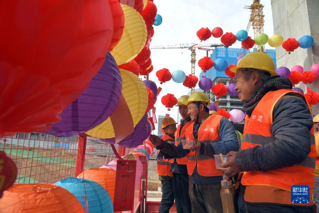 2月2日,施工人员在山东济南国际金融城北区项目现场猜灯谜。