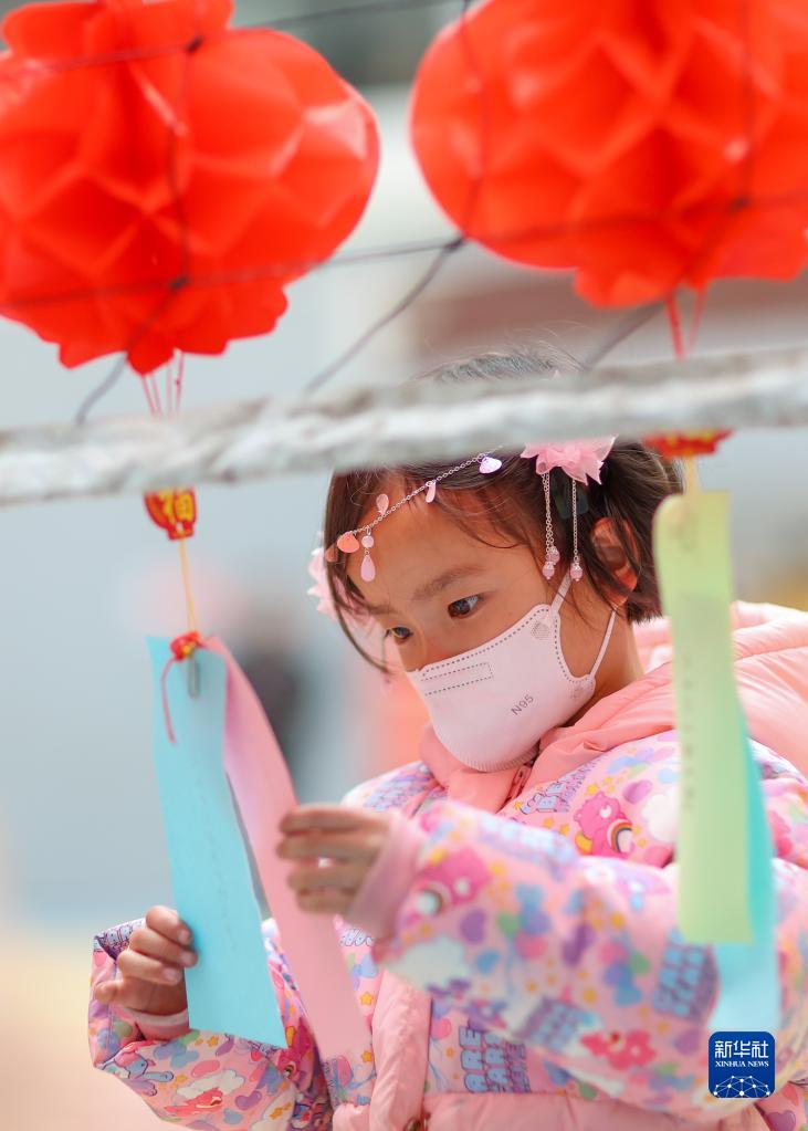 2月2日,贵州省黔东南苗族侗族自治州丹寨县的小朋友在迎元宵活动中猜灯谜。