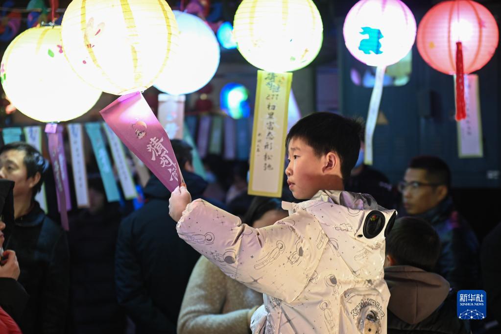 2月2日,小朋友在浙江省湖州市南浔区菱湖镇在古镇景区猜灯谜。