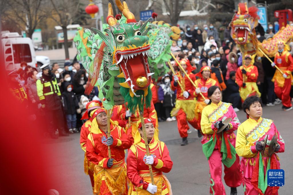 2月2日,龙鼓方阵演员在河北省石家庄市井陉矿区举办的民间花会展演活动中进行踩街巡演。