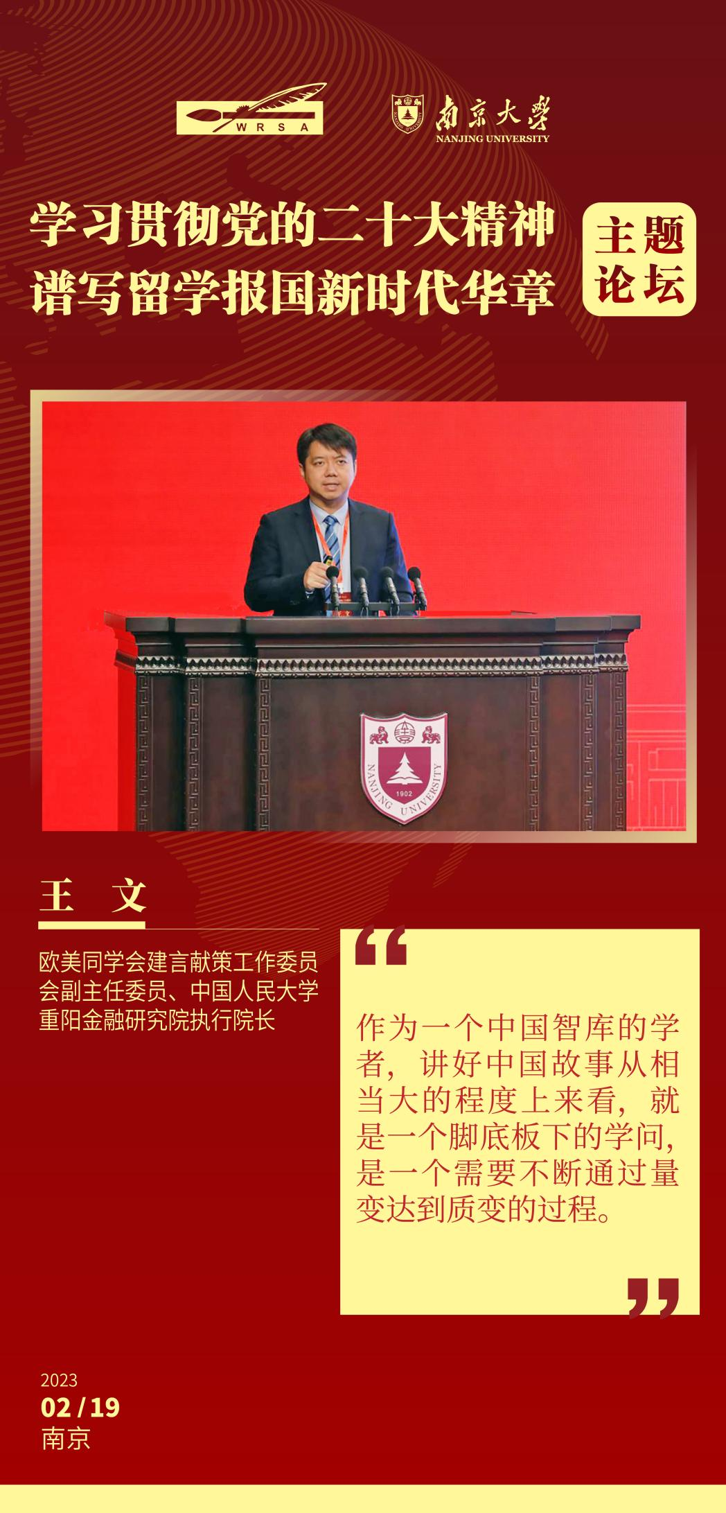 2月19日,由欧美同学会(中国留学人员联谊会)和南京大学共同主办、江苏省欧美同学会协办的“学习贯彻党的二十大精神谱写留学报国新时代华章”主题论坛在南京隆重举行。在主论坛主旨演讲环节,欧美同学会建言献策工作委员会副主任委员、中国人民大学重阳金融研究院执行院长王文作了题为《努力做讲好中国故事的先锋——调研俄罗斯21城归来看国际传播》的精彩分享。