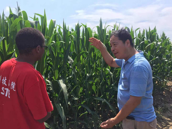 张宏彦教授在三百亩试验基地给非洲留学生阿曼尼讲解玉米高产技术。受访者供图