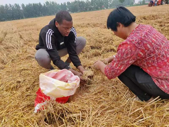 2019级中非科技小院留学生戴维和王庄村村民一起捡收割机丢下的麦粒。受访者供图