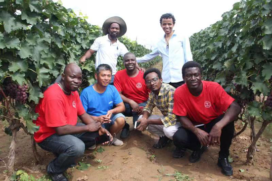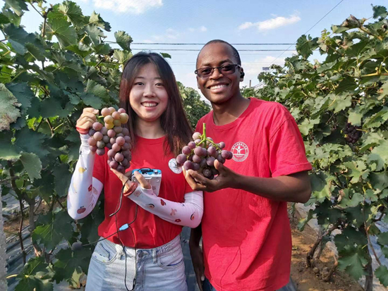非洲留学生在前衙村葡萄园和农民交流种植经验。受访者供图
