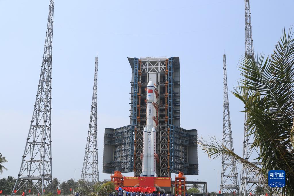 5月7日,天舟六号货运飞船与长征七号遥七运载火箭组合体垂直转运至发射塔架。