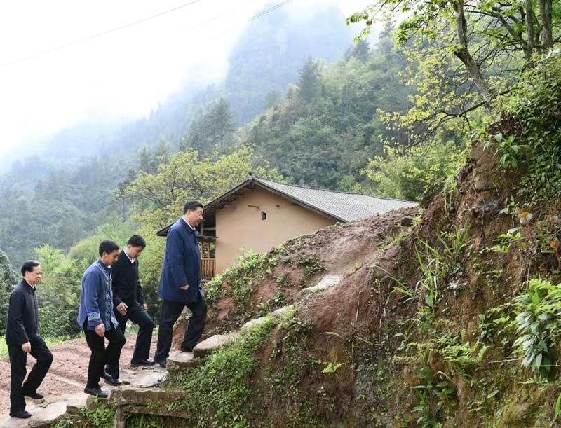 △2019年4月15日,习近平总书记在重庆市石柱土家族自治县中益乡华溪村前往贫困户谭登周家看望。