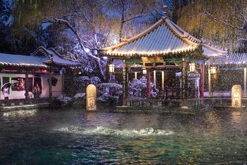 12月12日,山东济南迎来2025年入冬以来首场降雪,济南趵突泉公园里白雪皑皑,美不胜收。